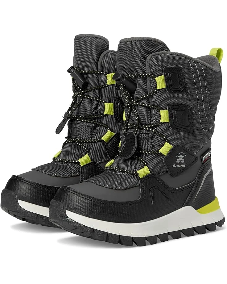 - Cool, confident, and ready for anything-introduce your child to the Kamik® Kids Bouncer 2 boots, where style meets function. Crafted for the urban adventurer, these boots boast a rugged yet sleek design with waterproof nylon and synthetic leather, backed by a DriDefense membrane to keep feet dry. With HEAT-MX™ sustainable thermal insulation, they stay cozy in temperatures as low as -40°F. The moisture-wicking fleece lining ensures comfort, while the bungee lacing system with easy-grab lace lock offers a secure fit. Safety is a priority with NiteRays reflective technology, and the self-cleaning treads with GripXT provide confidence on slippery surfaces.