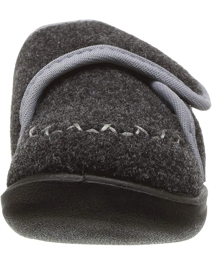 - Slip-on construction features a hook-and-loop ankle strap, fabric lining, cushioned footbed, and a rubber outsole.