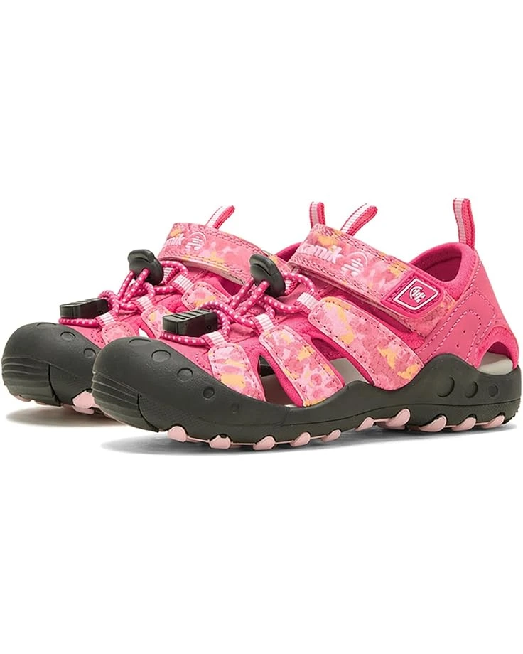 These adorable adventure sandals have lasted all Summer for our now 6.5 yo daughter. The style is cute, the fit is easy and comfortable. These sandals have endured stepping and running through shallow puddles, grass, dirt, rocks, and dusty trails. They wash up well but there was some staining (I only tried a bit of soap and water and no stain remover), but are still looking great.