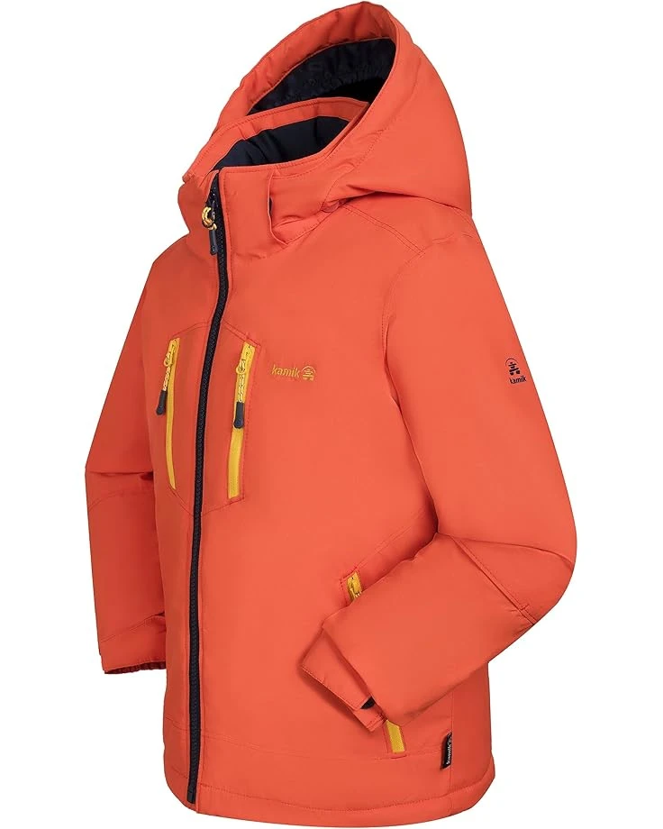 - Wear the Kamik® Kids Hux Insulated Jacket to keep yourself warm and cozy on a chilly day. It has a bionic finish eco water repellant coating making the jacket perfect for rainy days. The full sleeves jacket features all polyfill insulation, 3m® reflective details for safety, a snow skirt with gripping elastic, a detachable hood, and spandex knit cuffs.