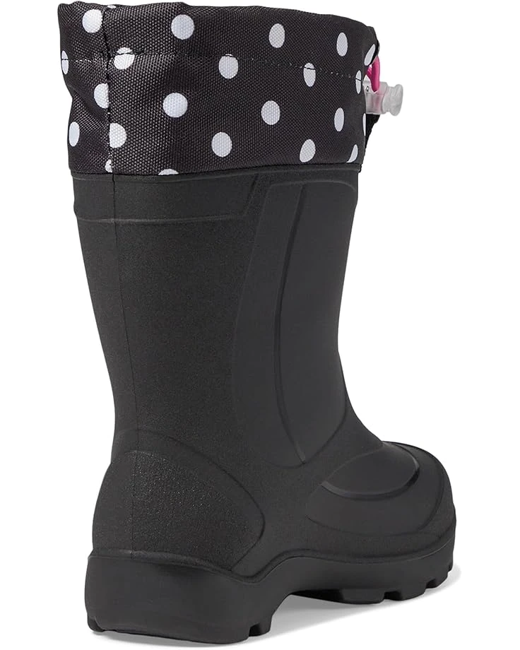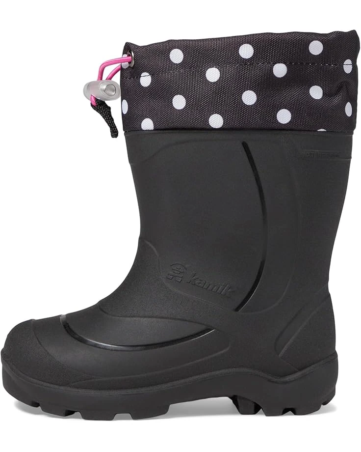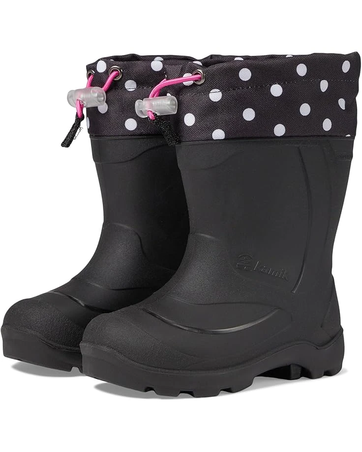 - The stylish and practical Kamik® Kids Snobuster 2 Boots are perfect for long walks in winter. With a waterproof and recyclable lightweight synthetic RubberHe upper, the all-weather boot is perfect for walks in the snowy woods to a fall fishing trip. These vegan-friendly shoes come with polka dot detailing on the cuffs, polyester lining, rubber insole, and bungee closure.