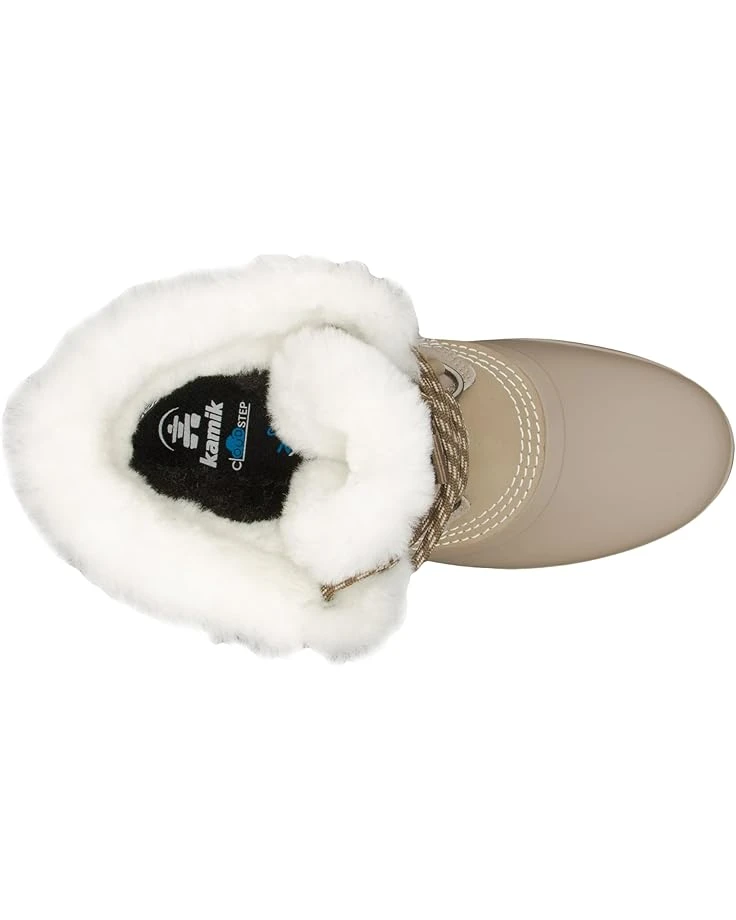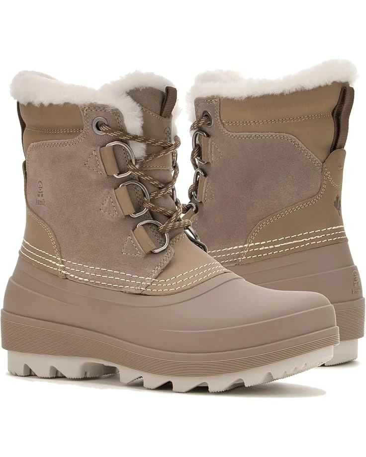 - Pamper your feet wearing the fashionable Kamik® Lauren Lo. Crafted from seam-sealed waterproof genuine suede and leather upper, this pair of boots features D-ring lace-up closure with genuine shearling padded collar, moisture-wicking soft fleece lining, and round toe design.